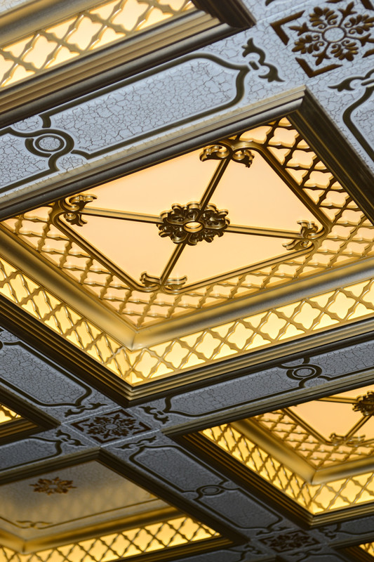 其設(shè)計(jì)理念來(lái)源于梵蒂岡的圣彼得大教堂穹窿頂,尤其是其巨大的圓形穹頂脊線有序排布的雕刻,錯(cuò)落排列的方格;而最核心的客廳頂產(chǎn)品設(shè)計(jì)理念則來(lái)源于米開(kāi)朗基羅設(shè)計(jì)的雙重圓頂,在雕刻精美的吊頂板之下設(shè)計(jì)一圈鏤空的光帶,讓光線自由發(fā)散,用光線來(lái)烘托板面的精致細(xì)膩,營(yíng)造如夢(mèng)似幻的空間氛圍。并借鑒其井字結(jié)構(gòu)的裝飾方式,在天花吊頂領(lǐng)域引入腰線裝飾的概念,以腰線做架構(gòu),營(yíng)造空間氣勢(shì),突顯細(xì)節(jié)的精致與非凡的格調(diào)。